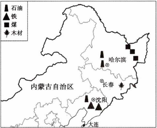 东北三省是我国著名的重工业基地。读东北三省部分资源分布图,完成5~6题。