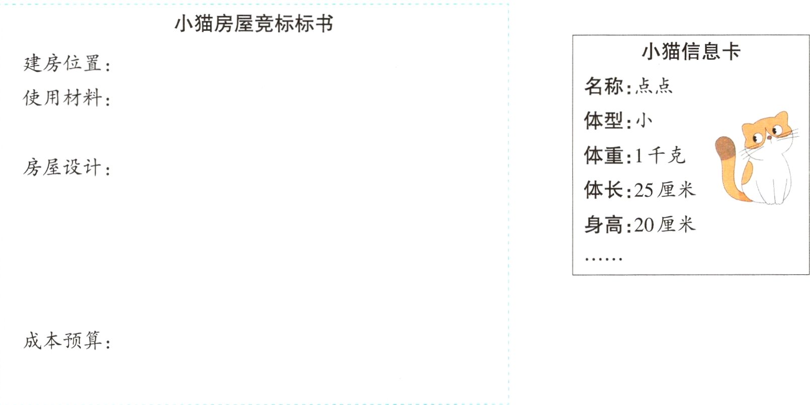 [新趋势·开放探究]萌小牛家收养了一只小猫,他和小组成员想给小猫做一个小房子。根据小猫的信息卡,我们来制订标书,参加投标。