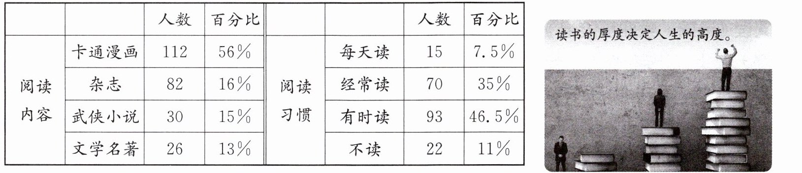 书籍@@网络@@报纸@@D@@示例:喜欢看卡通漫画的学生较多,有每天阅读习惯的学生较少。@@示例:读的书越多,积累的知识越多,就能站得更高,看得更远。