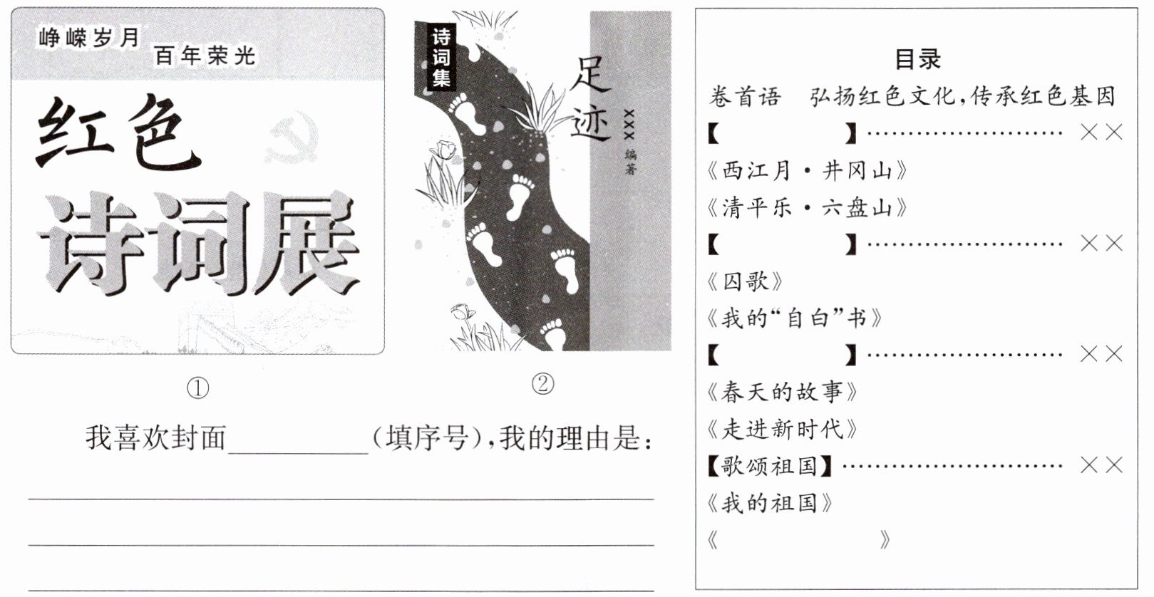 六年级(2)班的同学制作了一本红色诗词集,请你帮他们挑选封面,整理目录。