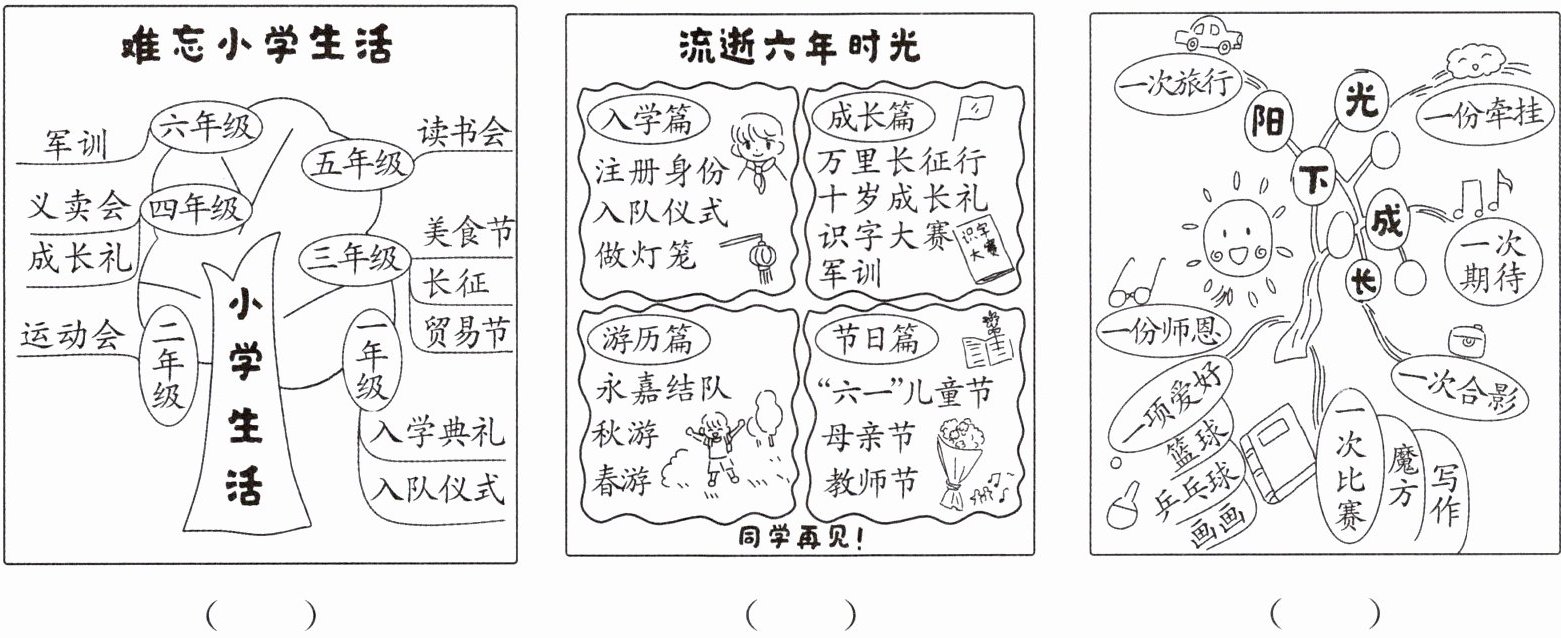 2. 下面的三个示例图分别是按什么方式来制作成长纪念册的?(A. 编年体 B. 栏目式)