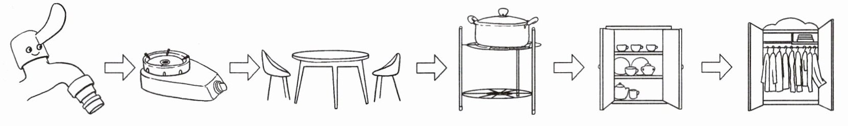 ①厨房锅架 ②衣柜 ③炉子 ④餐桌和炉台 ⑤自来水龙头 ⑥碗柜