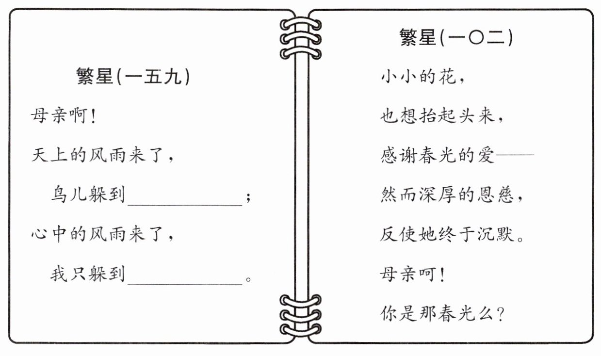 2. 将现代诗《繁星(一五九)》补充完整。诗中两次出现“风雨”,其中“天上的风雨”指的是____,“心中的风雨”指的是____。