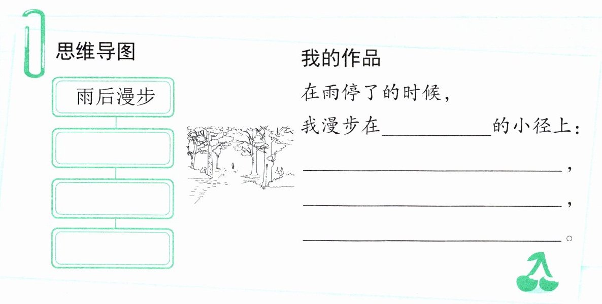 分享自己雨后漫步的经历。先完成“思维导图”,再把“我的作品”补充完整。
