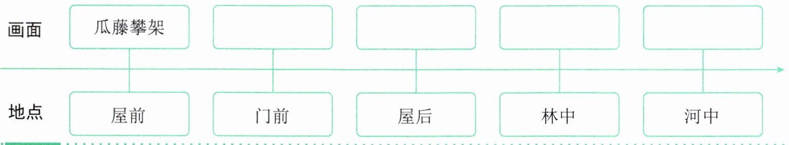 鲜花轮绽@@绿竹成荫@@鸡群觅食@@鸭子戏水觅食@@解析:本题考查对课文内容的整体感知和提炼关键词句的能力。课文具有很强的画面感,开篇从屋前写起,抓住瓜架上瓜和藤、叶的颜色,绘出了“瓜藤攀架”图;再以“有些人家”衔接,依着时令介绍门前的鲜花,勾勒出“鲜花轮绽”图;又以“还有些人家”过渡,笔锋转向屋后的青竹和鲜笋,描绘了“绿竹成荫”图;紧接着,作者的视线转到竹林中的鸡群,最后转到小河中的鸭子,分别描绘了“鸡群觅食”图和“鸭子戏水觅食”图。根据地点提示,找出相关句子提炼出关键词,即可完成练习。