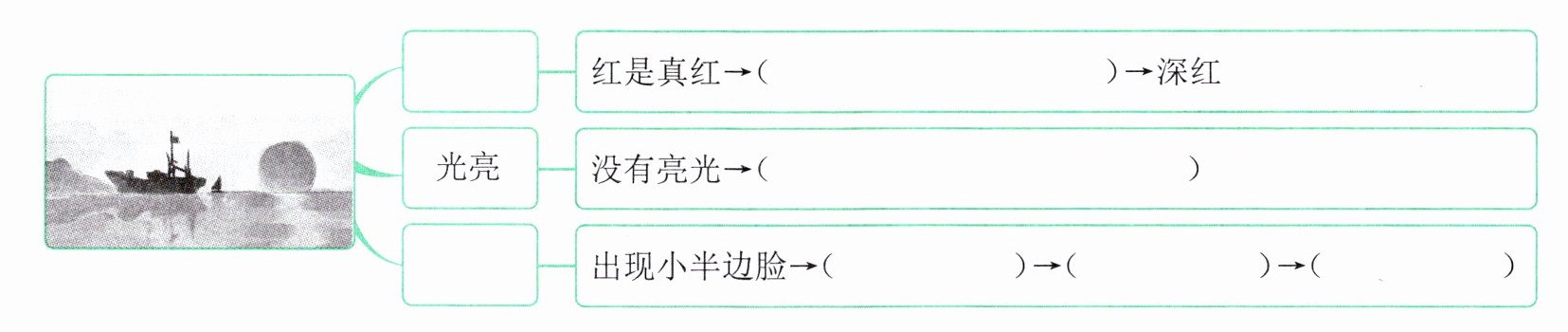 位置@@冲破阻碍、势不可当@@示例:一眨眼@@一瞬间@@转眼间@@过了一会儿@@一刹那间@@颜色@@红得非常可爱@@发出了夺目的亮光@@位置@@努力上升@@冲破了云霞@@完全跳出了海面@@太阳变化@@太阳喷薄而出时的壮观景象