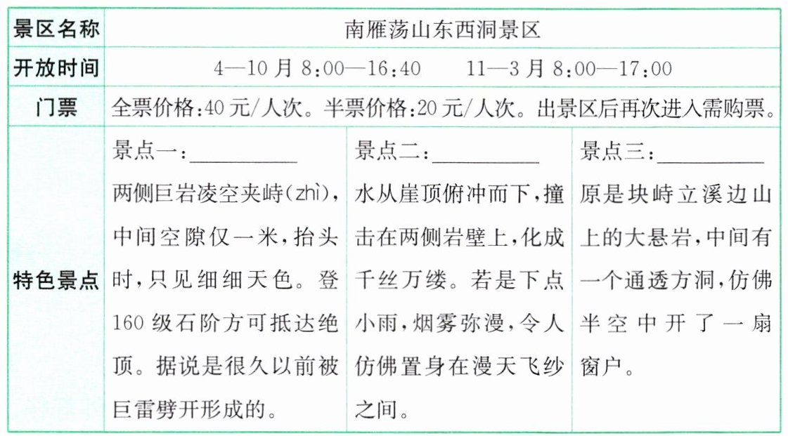 (2)南雁荡山东西洞景区只有一线天、梅雨瀑、石天窗三个景点。 ( )