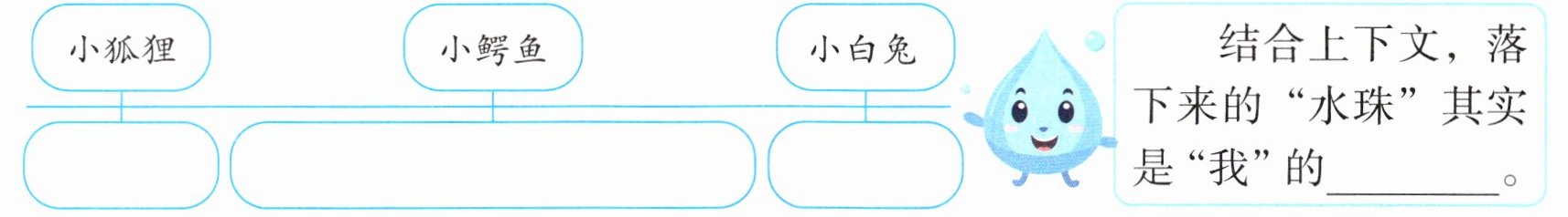 1. C D A B 解析:本题考查借助加点字词体会人物说话语气的能力。“咦”表示疑惑或惊讶,小狐狸发出“咦”的声音是因为感觉到有水珠,可并没有下雨,很疑惑,故选C。“唉”表示无奈,“我”发出“唉”的一声是因为大家不知道水珠是“我”的口水,很无奈,故选D。“噢”通常表示理解或领悟,“我”发现最了解“我”的人还是妈妈,很感动,故选A。“哎呀”表示惊讶,“我”意识到自己的秘密被妈妈发现了,很惊讶,故选B。 2. 下雨了 小松鼠的牛奶打翻了或虫子撒的尿 大树在哭 口水 3. “小馋猫,肚子饿了,对吧?英英!”妈妈说话了,还对我眨了一下眼睛。 4. 示例:也不对,这是大树在流汗。