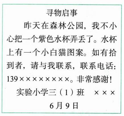 任务三: 从森林公园回到家后的第二天早上,你才发现自己的水杯丢在森林公园了,水杯是紫色的,上面有一个小白猫图案,请你写一则寻物启事。(注意格式)