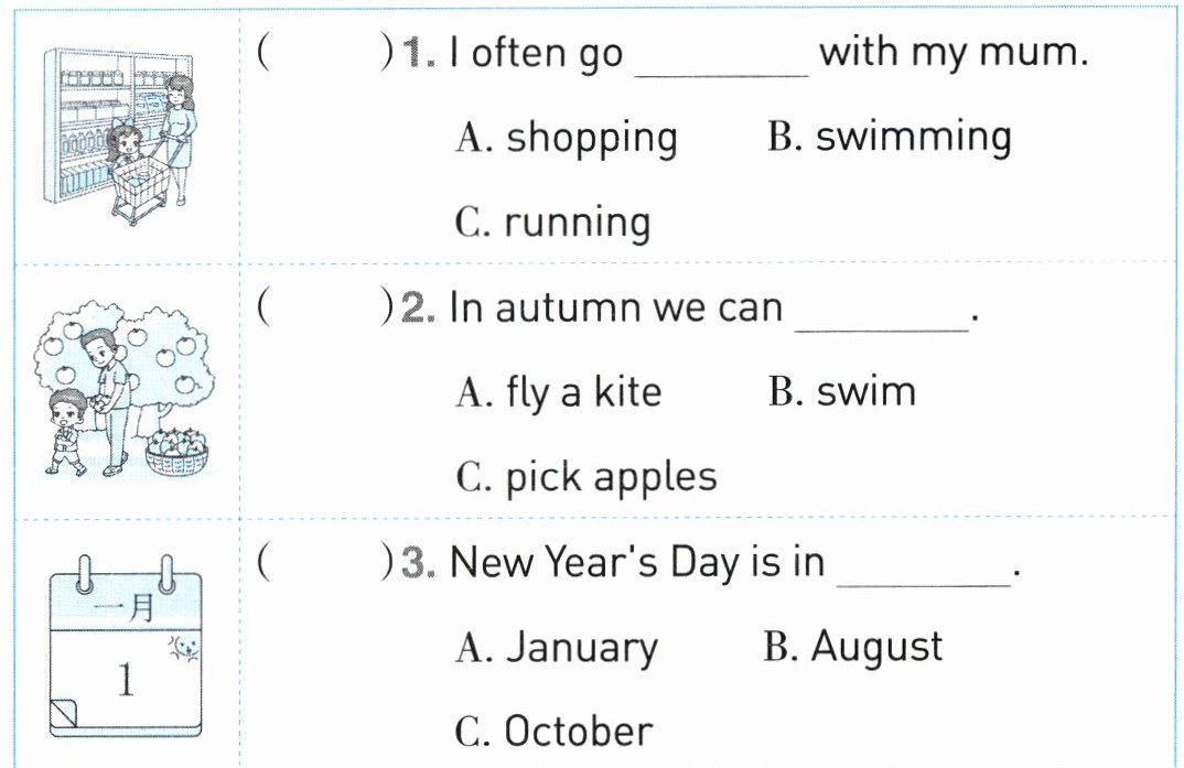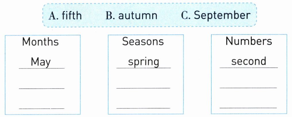 Months: C, October; Seasons: B, summer; Numbers: A, third(补充的同类词答案不唯一)