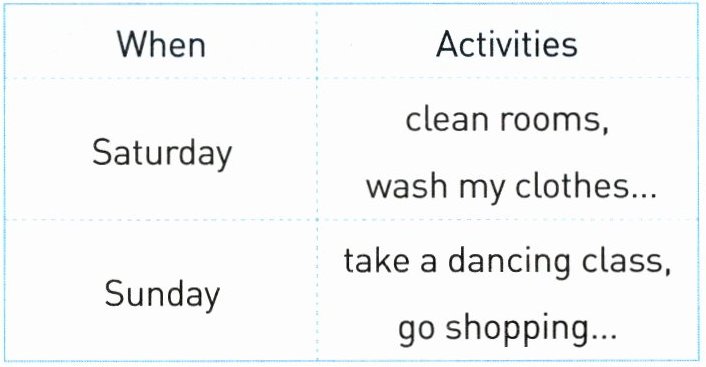 On Saturday morning, I often clean the rooms. I clean the bed, the desk and the floor. Then I wash my clothes in the afternoon. On Sunday, I always take a dancing class in the morning. And after the dancing class I usually go shopping with my mum. We buy many things, and then I have a big dinner with my family.