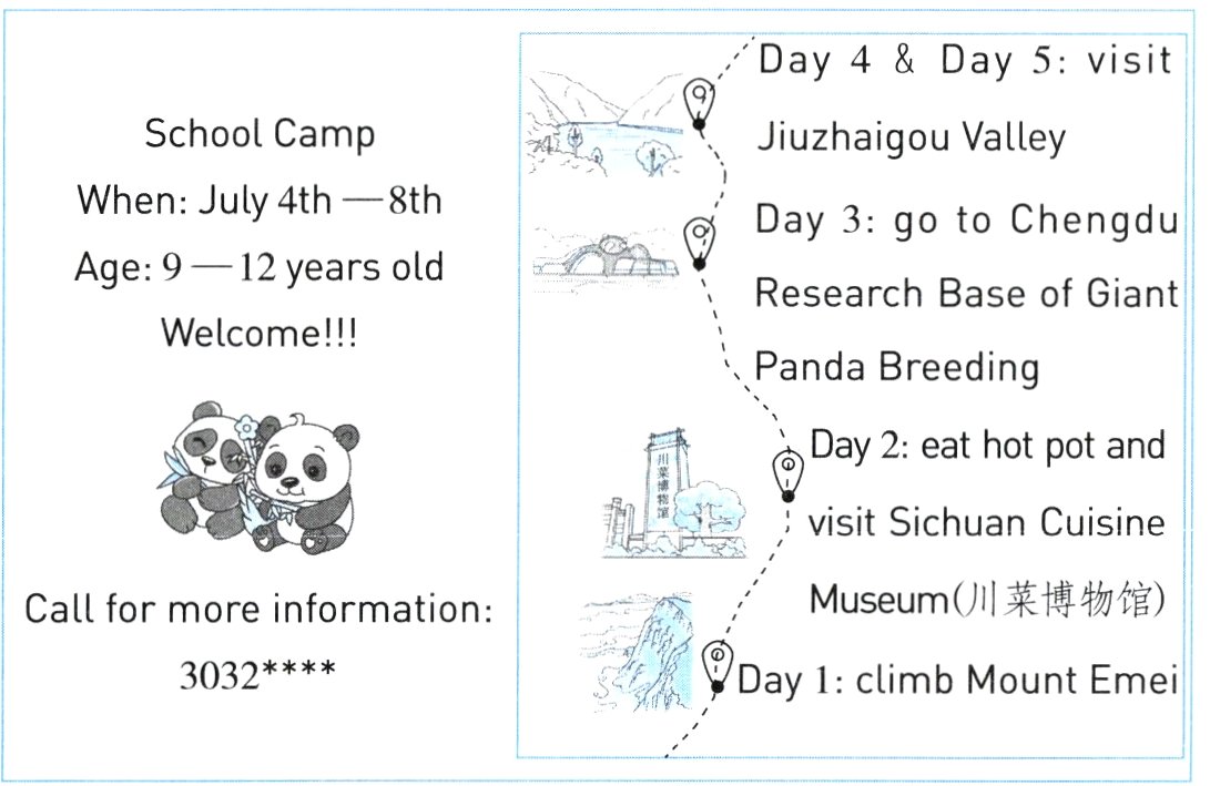 ( )1. The school camp is in Sichuan for five days.