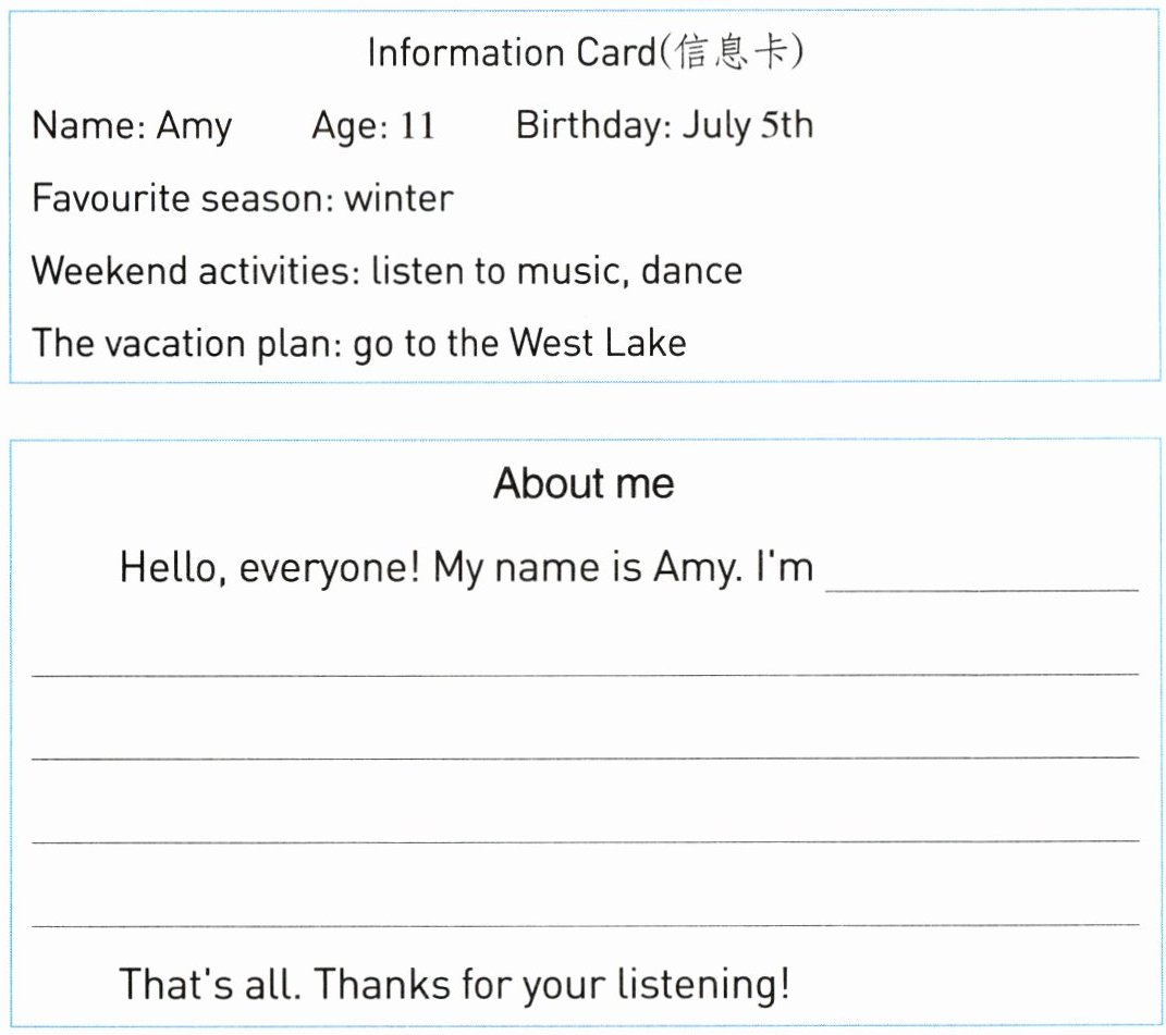 范文: About me Hello, everyone! My name is Amy. I'm eleven years old. My birthday is on July 5th. My favourite season is winter. Because I can play in the snow and make a snowman in winter. I often listen to music and dance on weekends. I will go to the West Lake this summer vacation. That's all. Thanks for your listening!