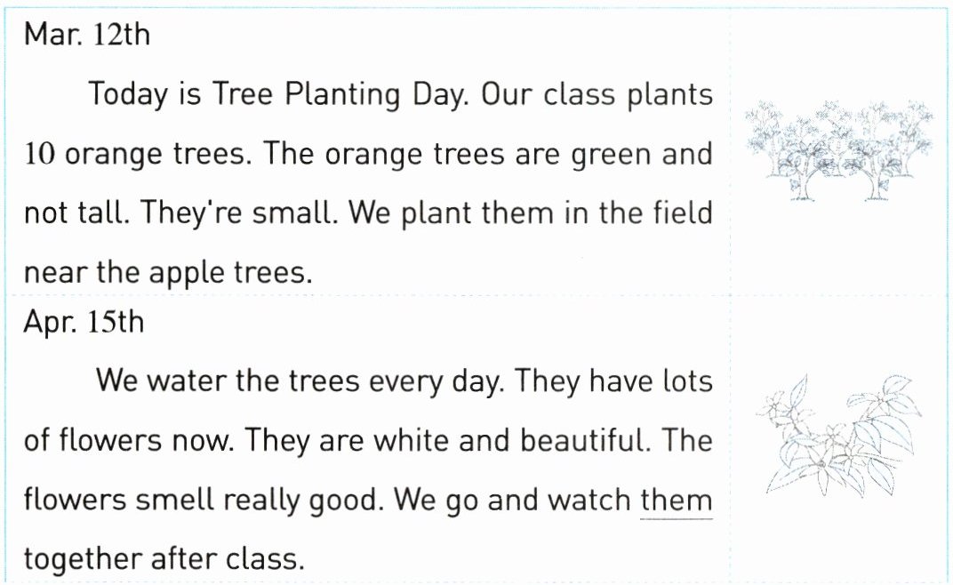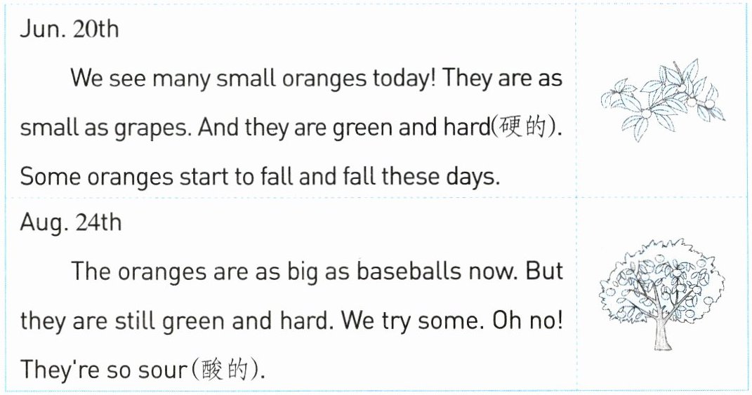 1. B 点拨: 根据第一篇日记中“The orange trees are green and not tall. They're small.”可知,三月的时候橙子树是绿色的,它们不高而且很小,故选B。