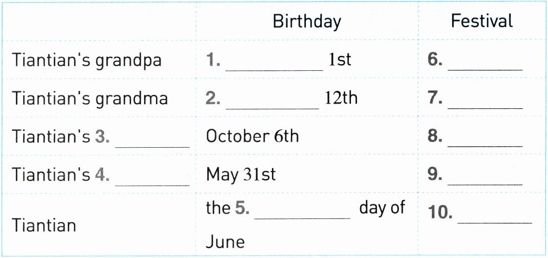 四、新考法.信息提取Tiantian在介绍家人的生日。听短文,在1~5小题的横线上填单词,并为6~10小题选择相应的图片。(10分)