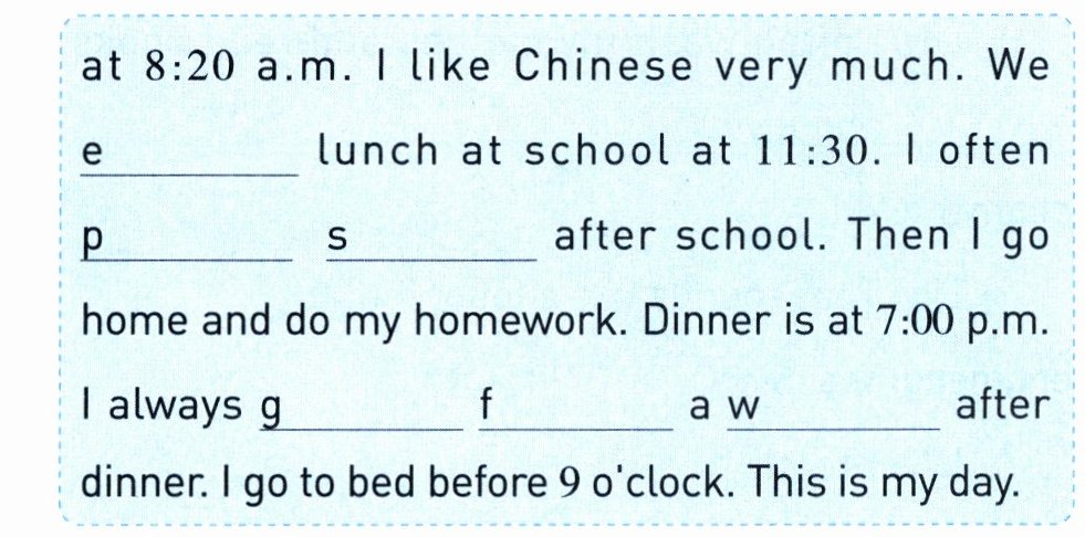 1. do morning exercises 2. 8:30 a.m. 3. go back to school 4. 5:00 p.m. 5. 7:00 p.m.