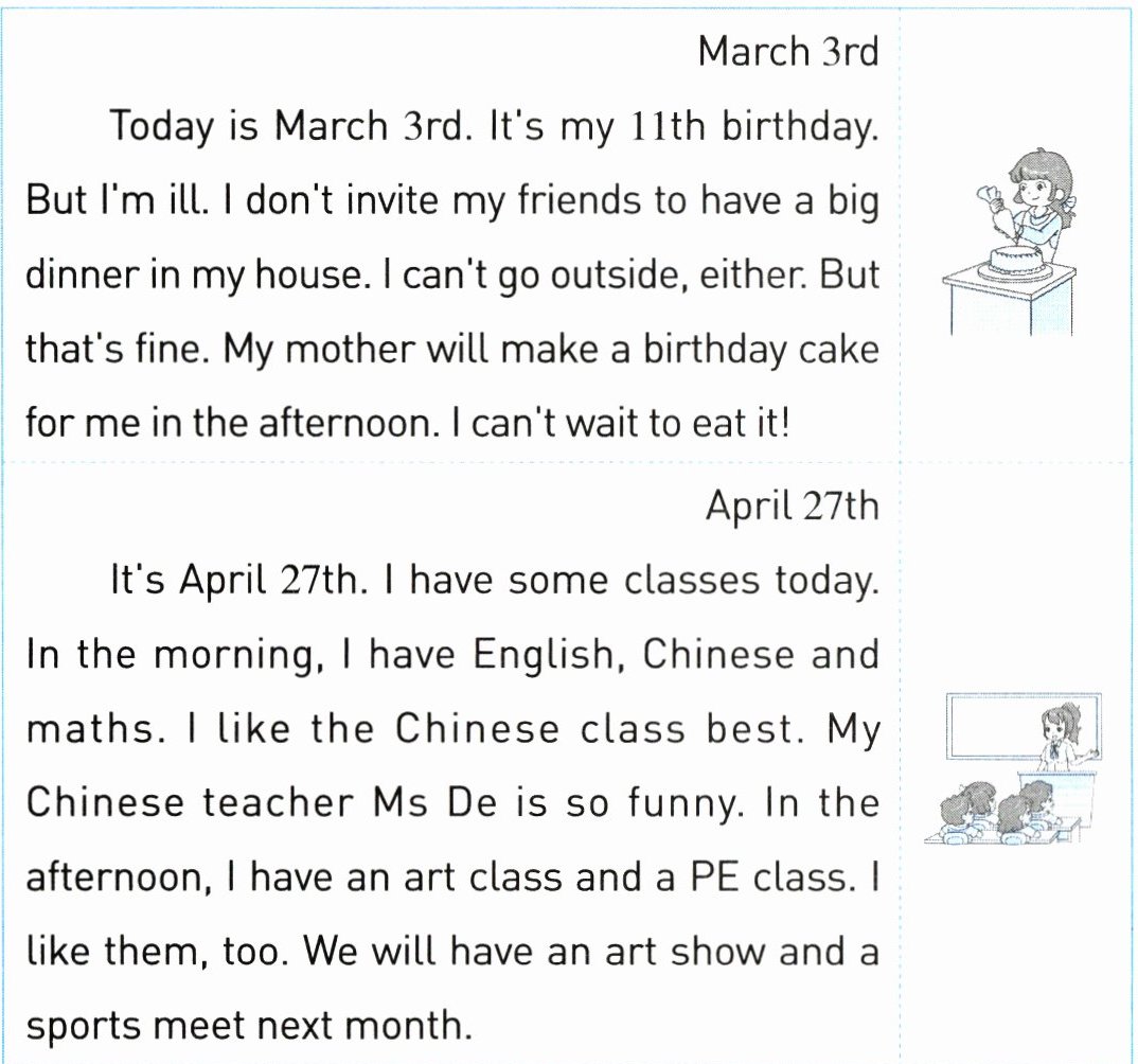 (二)(浙江省温州市)Tiantian喜欢用日记记录自己的日常活动。阅读日记,选择正确的答案。(10分)
