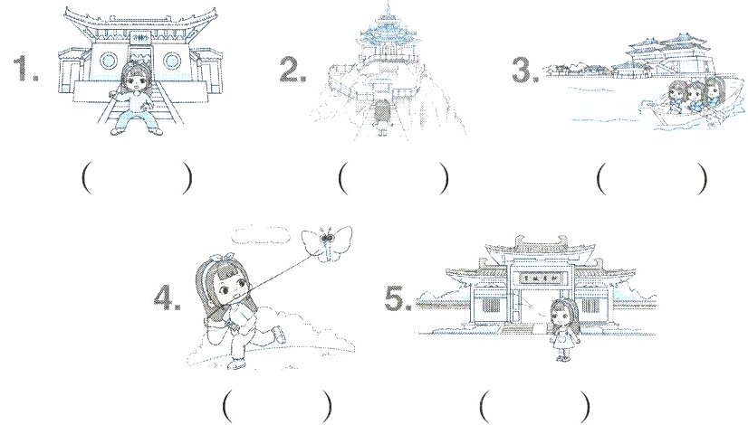 任务一:Mengmeng给Lily寄去了哪些照片呢?根据材料内容,在相应的照片下面打”√”。(4分)