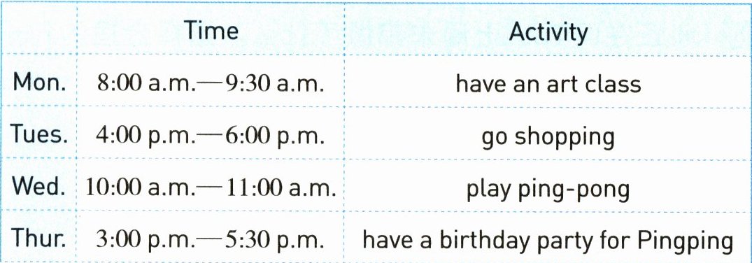 Last Monday, I 1.____________ an art class from 8:00 a.m. to 9:30 a.m. On Tuesday, I 2.____________ shopping in the afternoon. I 3.____________ ping - pong on Wednesday morning. Pingping's birthday 4.____________ on Thursday.