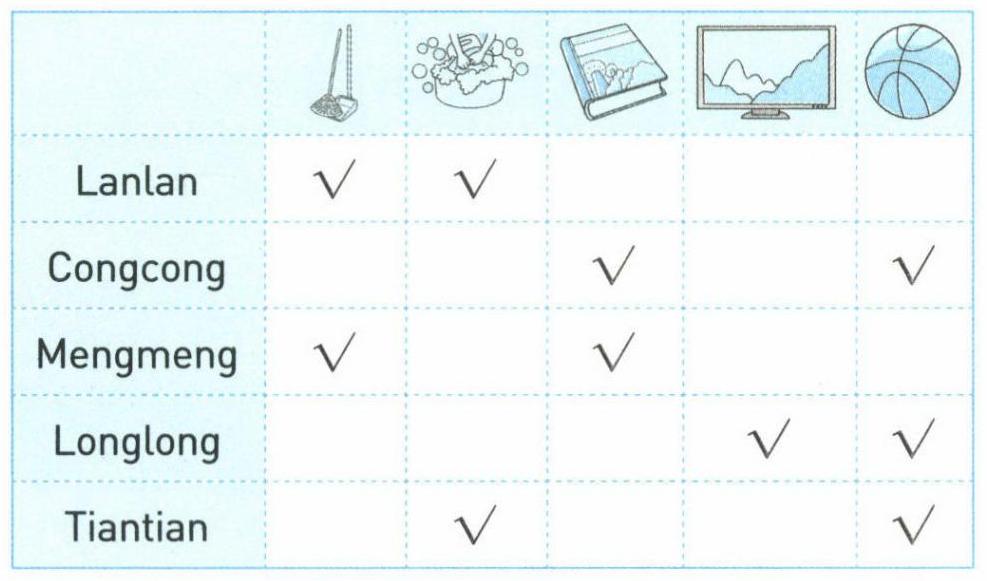 任务二:Diandian的几个好朋友上周六都做了什么呢?读Diandian 的调查报告,在表格相应的位置打“√/”。(5分)
