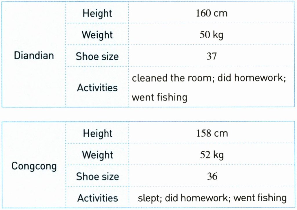 Diandian and Congcong are good friends. Diandian is taller than Congcong. But Congcong is heavier than Diandian. Diandian's shoes are bigger than Congcong's. Last weekend, Diandian and Congcong went fishing together after they did their homework in the morning. Diandian cleaned the room, but Congcong slept in the afternoon.