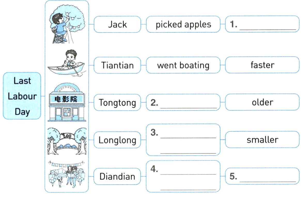 四新考法.框架梳理晚上Diandian在网上和小伙伴们一起回顾了去年五一的活动。听Diandian的讲述,在横线上填入正确的单词或词组。(10分)
