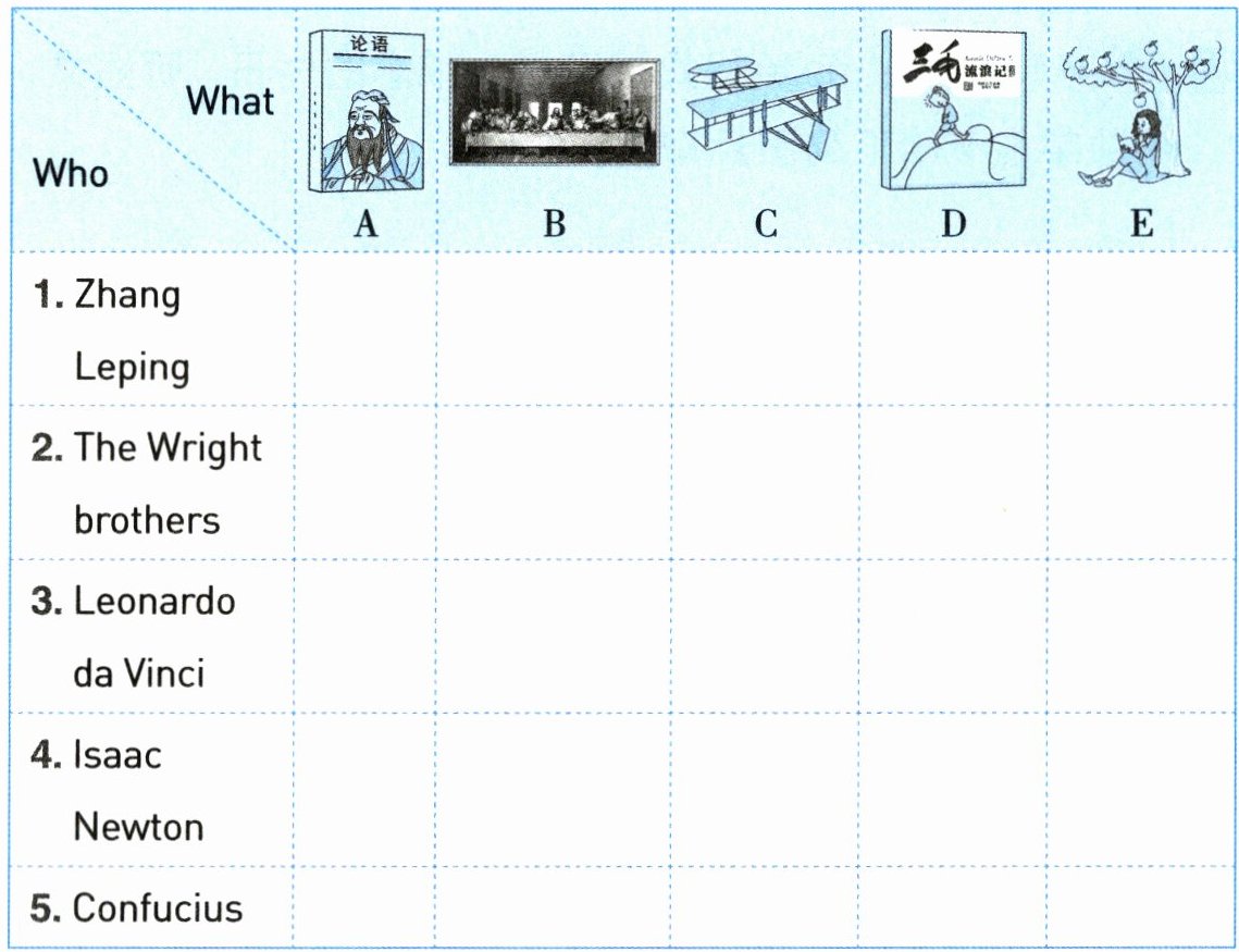 五 新情境.名家魅力(广东省深圳市改编)听对话,在表格相应的位置打“√”。(15分)
