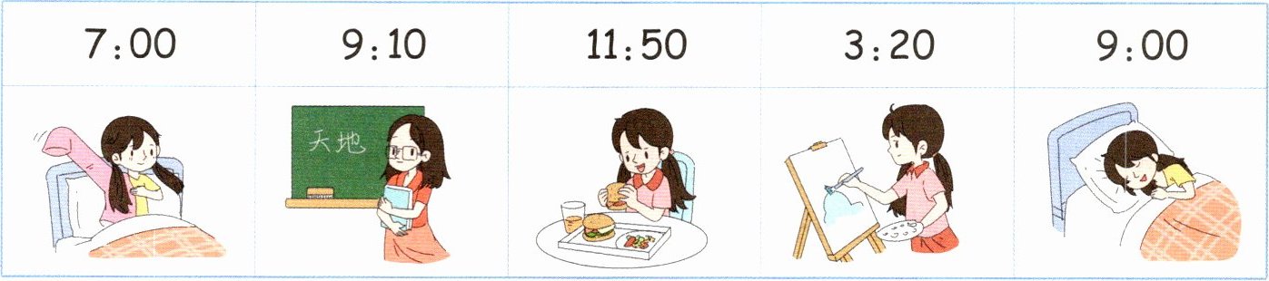 1. I ____________ at seven o'clock. 2. At 9:10, I have a ________ class.