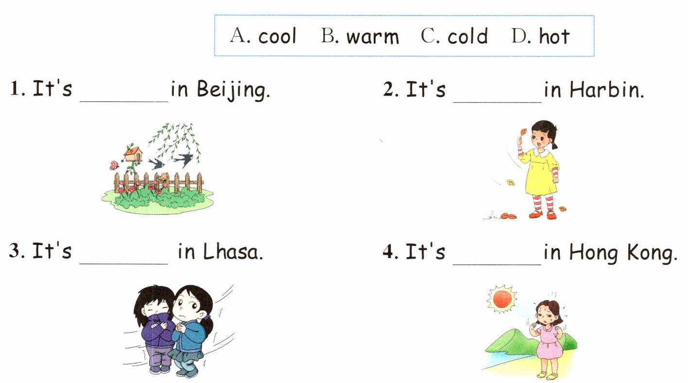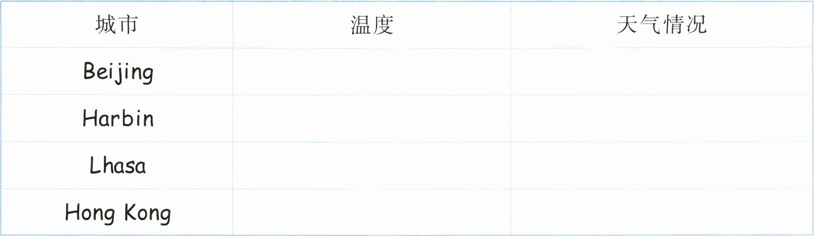 Good morning. This is the weather report. It's 20 degrees in Beijing. It's warm. It's five degrees in Harbin. It's cold. It's fifteen degrees in Lhasa. It's cool. It's thirty degrees in Hong Kong. It's hot.