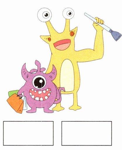 三、读一读小怪物们的自我介绍,找出含有与例词画线部分相同发音的单词,将其写在横线上,并根据描述在框中写出它们的名字。