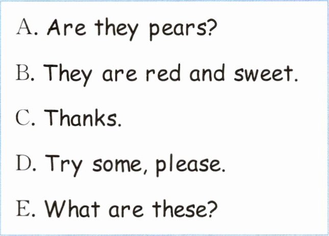 Look at these! Are these pears?@@Yes, they are.@@Wow! They’re so big!@@Try one!@@Thanks. It’s so sweet.