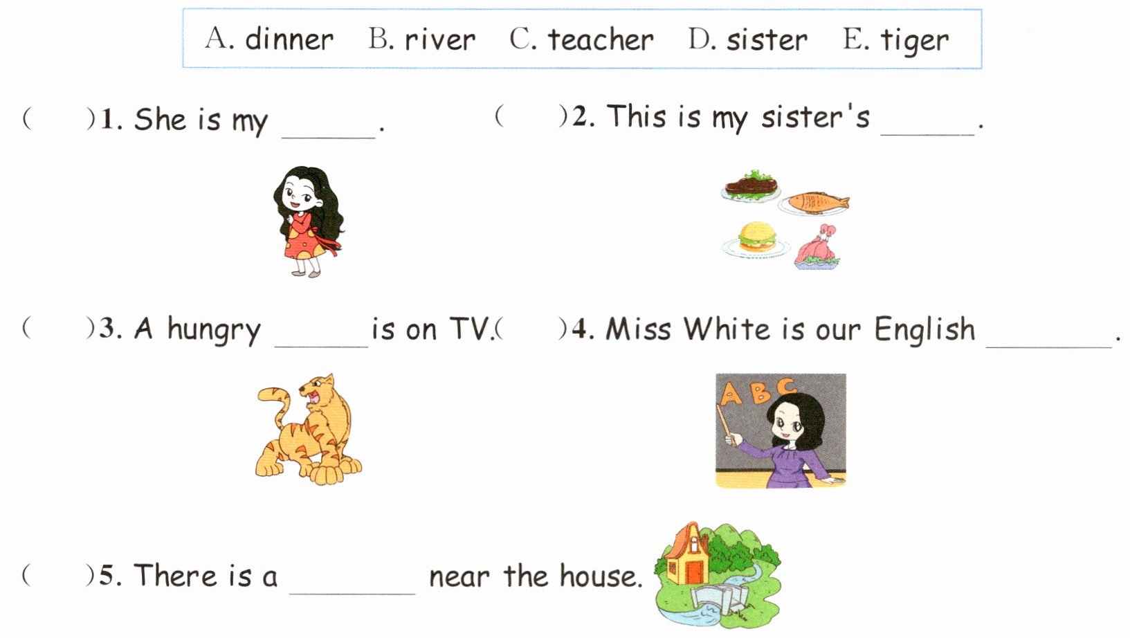 ( )3. A. ruler B. eraser C. tiger ( )4. A. afterB. where C. teacher
