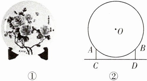 8.(东营模拟)日常生活中常见的装饰盘由圆盘和支架组成(如图①),它可以看作如图②所示的几何图形. 已知 $AC = BD = 5$ cm,$AC\perp CD$,垂足为点 C,$BD\perp CD$,垂足为点 D,$CD = 16$ cm,⊙O 的半径 $r = 10$ cm,则圆盘离桌面 CD 最近的距离是 .