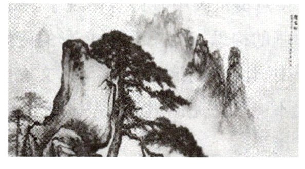 示例一:画面由一棵松树、一方巨石、数座山峰和云雾组成。画作主体是一棵高大的松树,这棵松树向一侧伸展出强壮的臂膀,枝繁叶茂,四周云雾缭绕,远处是数座钻出云雾的山峰。这松树仿佛腾云驾雾落到了山巅。松树紧挨一方巨大的岩石,树干下部隐入山石中,原来它能高驾于峰顶云端,源自“咬定青山不放松”的意志和自强不息、进取向上的精神。画作融主观与客观、静与动、自然与理趣于一体,构思不落窠臼,手法以形传神,具有发人深思的艺术魅力。