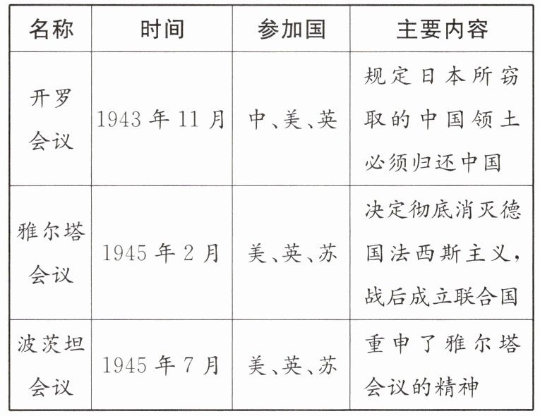 7. 图表分析 [2024山西模拟预测]在以“重大国际会议”为主题的项目化学习中,某同学绘制出下面表格,让同学们总结这三场会议的共同历史影响。你认为符合题意的是 ( )