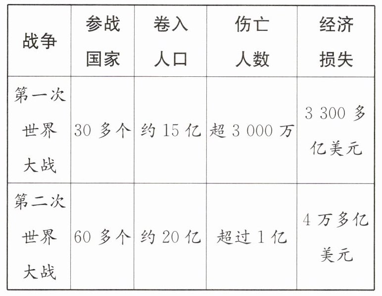 4. [2024成都模拟]20世纪上半期,人类历史经历了两次世界大战。根据下表可知,与第一次世界大战相比,第二次世界大战( )