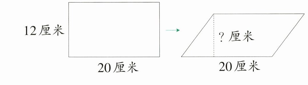 5. (名校期末真题)如图,李晓做了一个长20厘米、宽12厘米的长方形框架,把它拉成一个平行四边形,结果面积减少60平方厘米,你知道拉成的平行四边形的高是多少厘米吗?(7分)