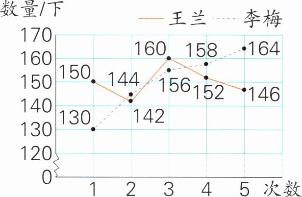 下图是王兰和李梅最近5次1分钟跳绳成绩统计图。