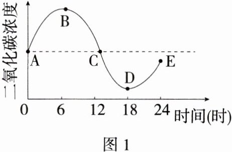 B 图1中,A~B段二氧化碳浓度上升,说明草莓的呼吸作用强度大于光合作用强度,A错误。图1中,B点和D点对应的分别是二氧化碳浓度最高和最低的时刻,在B点和D点时二氧化碳浓度达到平衡点,此时既不吸收二氧化碳,也不释放二氧化碳,说明草莓光合作用吸收的二氧化碳和呼吸作用释放的二氧化碳相等,即光合作用强度等于呼吸作用强度,B正确。图1中,有机物积累最多的时间是18时,C错误。分析图2可知,温度为20℃时草莓的二氧化碳释放量少于30℃时草莓的二氧化碳释放量,故夜间温度为20℃时草莓消耗的有机物少于夜间温度为30℃时草莓消耗的有机物,D错误。