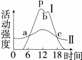 A@@Ⅰ代表的曲线只在白天进行,故表示的是光合作用,Ⅱ代表的曲线有光无光都能进行,故代表的是呼吸作用,A正确;a、c点是光合作用和呼吸作用的交点,此时植株光合作用强度等于呼吸作用强度,B错误;a~c段(不包括a、c点),光合作用强度大于呼吸作用强度,一直在积累有机物,故a、p、c三点中,c点有机物积累最多,C错误;b点时,光照过强,为了减少水分散失,部分气孔关闭,二氧化碳进入减少,光合作用减弱,但并没有停止进行光合作用,D错误。