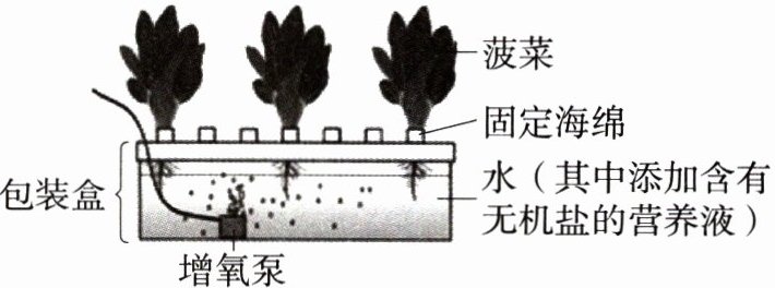 9. **跨学科·植物栽培类**如图所示,同学们利用包装盒制作水培装置种植菠菜。菠菜吸收水和无机盐的主要部位是根尖的(B7231001) ( )