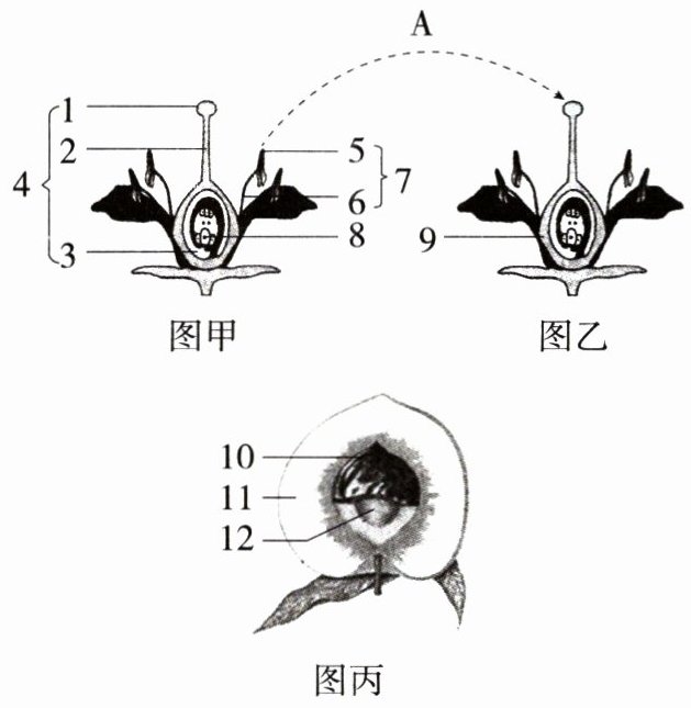 (3)花冠、花萼等结构凋落后,图甲中的[ ]__________将发育成桃的果实,图丙中的[12]桃仁是桃子的__________,它是由__________发育而来的。