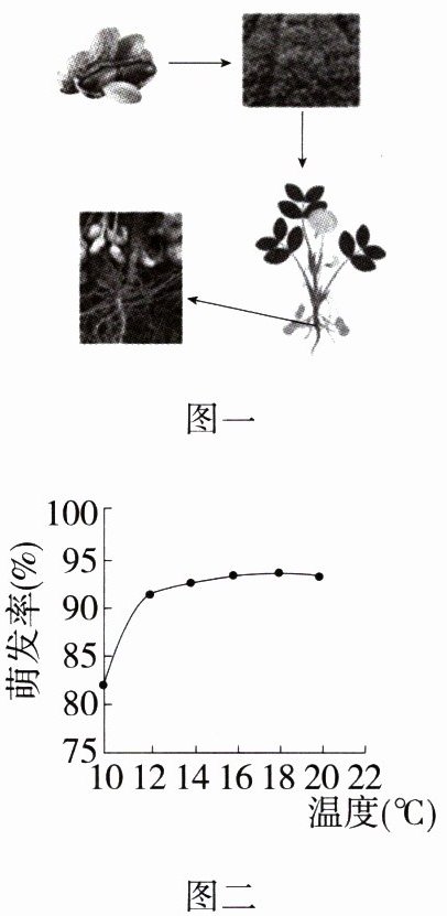 多个胚珠(或2 - 4个胚珠)@@子叶@@水@@呼吸作用产生了热量@@光照、二氧化碳@@氮@@12@@适宜的温度@@种子数量少,实验结果具有偶然性@@【评分细则】第(3)题第1空2分,其余每空1分,有错别字不得分。(3)第1空“光照”“二氧化碳”缺一不可。(4)第3空意思相近即可得分。解析:(1)植物经过传粉和受精后,子房发育成果实,胚珠发育成种子,花生果实中通常有2 - 4粒种子,是因为雌蕊的子房中含有多个胚珠。(2)花生进行泡种可以保证种子萌发过程中对水的需求。呼吸作用的实质是分解有机物,释放能量,浸泡后种子会出现发热现象,这是因为种子进行呼吸作用产生了热量。(3)影响植物光合作用强度的因素有光照、二氧化碳浓度等。“正其行”使植物接受充分的光照;“通其风”使植物周围有充足的二氧化碳,为植物的光合作用提供了充足的原料。花生根部有根瘤菌,根瘤菌有固氮的作用,所以花生生长过程中一般不需要施加氮肥。(4)由图二可知,当温度大于12℃时,花生种子的萌发率维持在相对稳定的较高水平,说明种子萌发需要适宜的温度。实验的不足之处是种子数量少,实验结果具有偶然性。