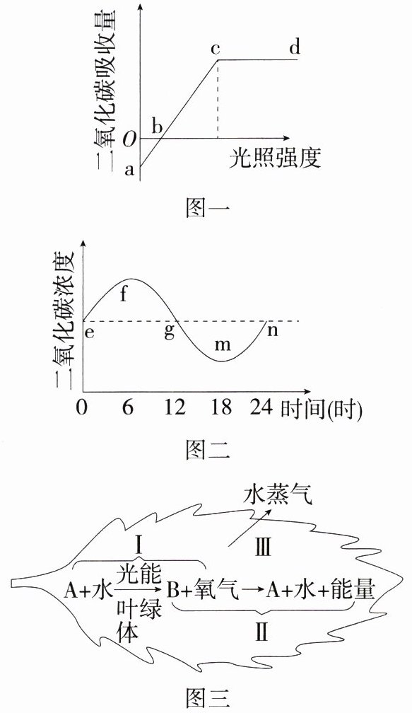 光照强度@@上@@>@@18时@@A@@二氧化碳@@线粒体@@水@@【评分细则】每空2分,有错别字不得分。解析:(1)由图一可知,在一定范围内,随着光照强度的增加,二氧化碳吸收量也随之增加。二氧化碳吸收量增加说明光合作用增强,因此根据图一曲线变化可以看出,影响光合作用效率的一个重要因素是光照强度。当大棚内温度降低时,呼吸作用强度降低,释放的二氧化碳减少,因此图一中的a点会向上移动。(2)光合作用吸收二氧化碳,呼吸作用释放二氧化碳,图二中fm段二氧化碳浓度呈现下降的趋势,说明此段时间内,光合作用强度大于呼吸作用强度。g点处于fm段内,因此g点光合作用强度大于呼吸作用强度。6时至18时,植物的光合作用强度大于呼吸作用强度,植物体内的有机物一直处于积累状态;18时以后,植物的呼吸作用强度大于光合作用强度,植物体内的有机物开始减少,因此一天内植物体内有机物积累量最多的时间是18时。(3)“正其行,通其风”的种植方法可以提高产量,主要是因为通风能够为植物的光合作用提供充足的二氧化碳。图三中Ⅰ表示的生理活动是光合作用,故通风可以为植物的光合作用提供充足的A二氧化碳。(4)呼吸作用的实质是分解有机物,释放能量,因此农作物生长、细胞分裂等生命活动所需要的能量主要是由图三中Ⅱ呼吸作用释放的,该生理活动主要发生在细胞的线粒体中。(5)植物吸收的水主要用于图三中Ⅲ蒸腾作用,蒸腾作用能促进植物从土壤中吸收水,促进水和无机盐从根部输送到茎、叶等器官,还能使植物有效地散热。