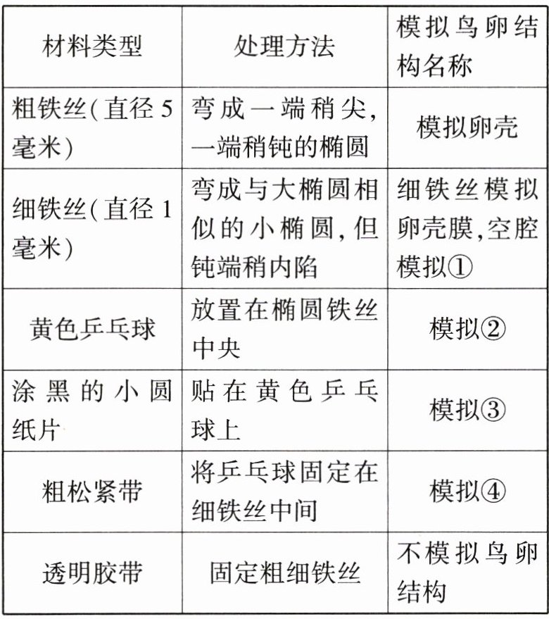 13.核心素养·探究实践(2023 河北行唐期末)学习完鸟卵的结构后,兴趣小组的同学用身边的一些简单材料(如表)和工具模拟鸟卵的结构,请根据所学知识回答问题: