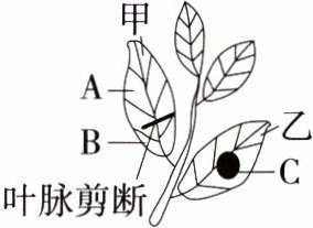 7.(2024 山东阳谷模拟)若将某植株一片叶的主脉切断(如图),另一片叶两面都贴上不透明的锡箔纸,在黑暗中放置24 小时后,再光照4 小时。取下两叶经脱色后用碘液处理,发现A 部位不呈蓝色,B 部位呈蓝色,C 部位不呈蓝色。以上实验能够证明光合作用需要( )