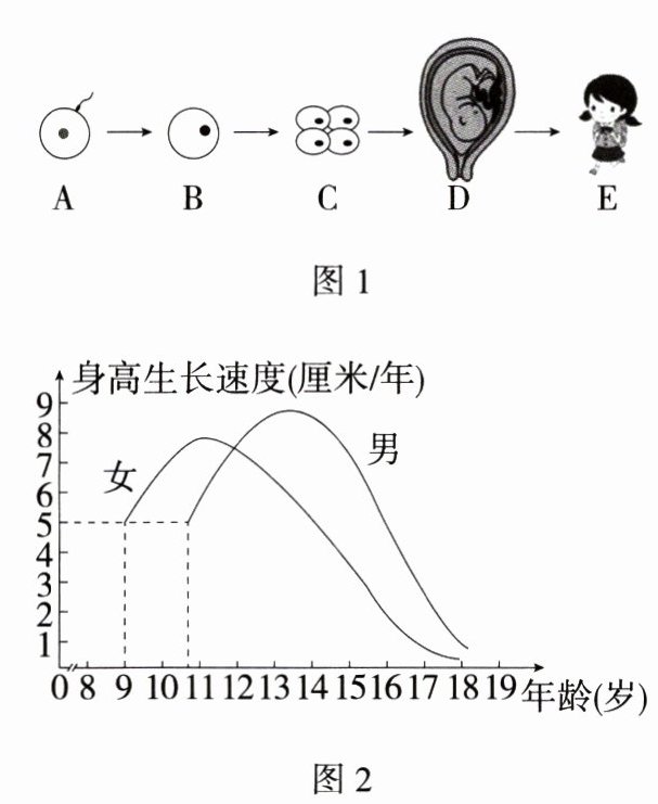 17.数据分析题·曲线图(2023 山东乳山期中)(12 分)图 1 表示欣欣在妈妈的精心呵护下,从一个受精卵发育成青春美少女的过程;图 2 表示某班级男女身高生长速度曲线图。请据图回答: