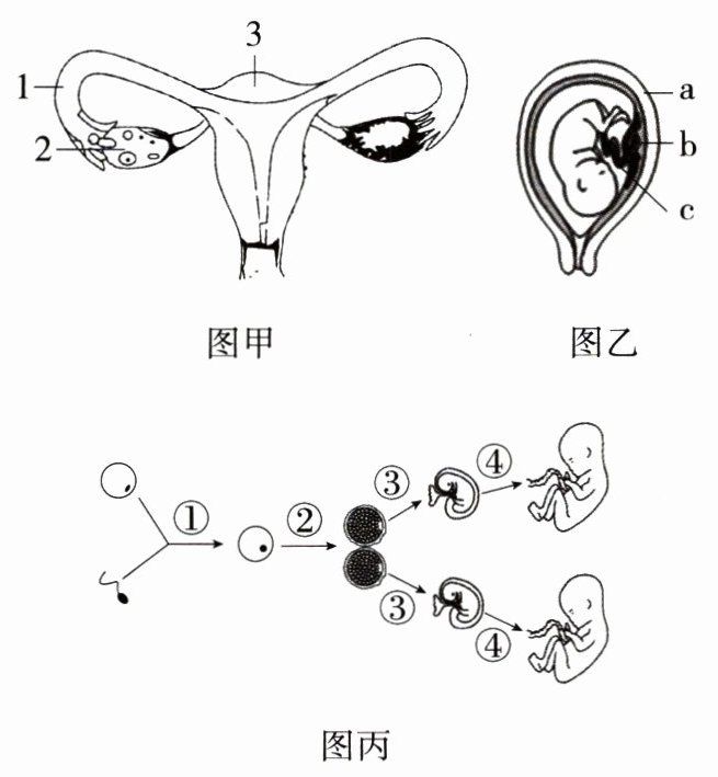 (4)图丙中,过程①发生在 _____中,两个胎儿的性别是 _____(填“相同”或“不同”)的。