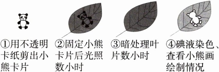 ①用不透明卡纸剪出小熊卡片 ②固定小熊卡片后光照数小时 ③暗处理叶片数小时 ④碘液染色、查看小熊画绘制情况