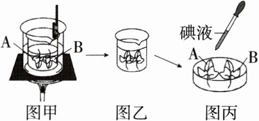 10. 项目式学习·实验情境(2023 山东烟台中考,13,★☆☆)将两盆牵牛花分别放在两个密闭装置中,A 叶片所在的装置中放入一小杯清水,B 叶片所在的装置中放入等量的氢氧化钠溶液。两个装置都放在暗处一昼夜后,移到阳光下照射2 小时,摘下A、B 叶片进行如下实验。以下叙述正确的是( )